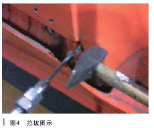 步骤四:用拉力锤拉住垫片,然后轻轻拉击。注意观察所拉周围因拉力产生的变形,一般车辆受到撞击,都会有受力点和方向,我们可以根据受力点和方向及损坏的程度来判断出力的大小,如果一次难以拉拔出理想的状态,我们可以多增加几个拉拔点,直至拉拔到理想状态为拭如图4所示).