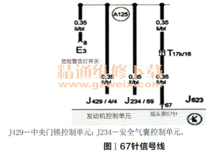 (3)这时考虑发动机控制单元是否因收到气囊引爆信号,而强制发动机熄火。根据气囊控制原理,气囊控制单元指令气囊引爆的同时,发给发动机和中控门锁控制单元信号,前者收到信号后强制切断喷油,后者收到信号后强制打开四个车门,同时危险警告灯闪烁。发动机控制单元67针用于接收该信号(图1),没有信号是12V,有信号是0。此时测量67针为12V,说明没有信号。经过插拔气囊控制单元插头,可以清除发动机控制单元的故障码。但是打开空调后突然自行熄火,此时67针仍保持12V,说明自行熄火的原因不是发动机控制单元收到误信号。