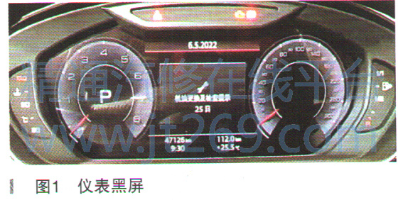 一辆行驶里程约4.7万km、配置3.0T CZSE发动机、OD5变速器的2020年奥迪A8L(D5)轿车。该车行驶中仪表黑屏(如图1所示)且熄火后发动机无法启动。