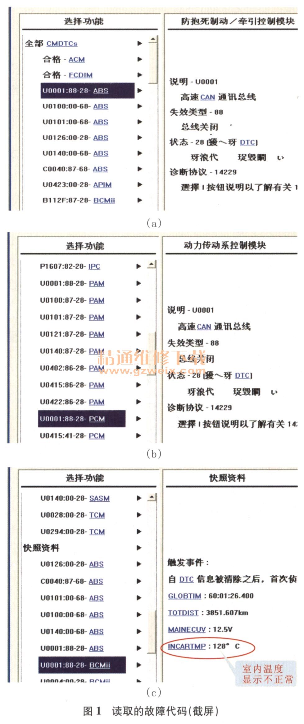 车辆拖进厂后,试着启动发动机,能顺利启动着机。利用IDS进行检测,读取的故障代码如图1所示。根据图IC得知室内温度为128℃,显然不正常。室内温度是由室内温度传感器传递给EATC自动空调控制模块),EATC通过MS-CAN传递给IC显示的,说明可能中速网络有故障,而故障现象和故障代码都显示是高速网络故障。