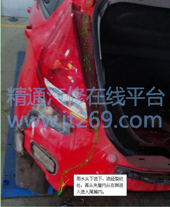 下雨时,水流从上到下,流经此处,长时间的流趟,进入夹层内,尾箱内夹层右侧最低点比左边低,所以从右侧进入尾箱内,这也是我们第一次换灯后,为什么用高压水枪冲水,不会进水,而下雨天放在外面一晚后,又进水的原因;因为此处进水的多少,起决定原因的时淋水的时间,而不是表面冲水的压力,开胶处理后试水正常,故障排除。