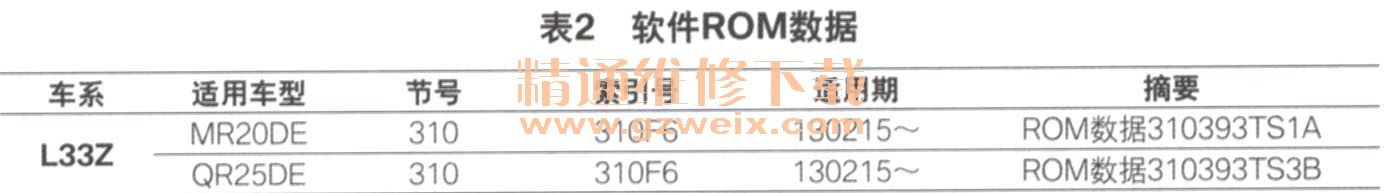(3)检查CONSULT-III plus诊断系统的软件版本是否为最新,在进行确认后使用该诊断系统安装“新世代天籁空白ATC U作业日志文件”。通过CONSULT-III plus诊断系统可以查看自动变速器控制单元的原始零件号、编写程序后的零件号、备件订货零件号以及保修主要零件号。相应车型自动变速器控制单元的组合样式如表1所示,而通过备件查询到的软件ROM数据如表2所示。