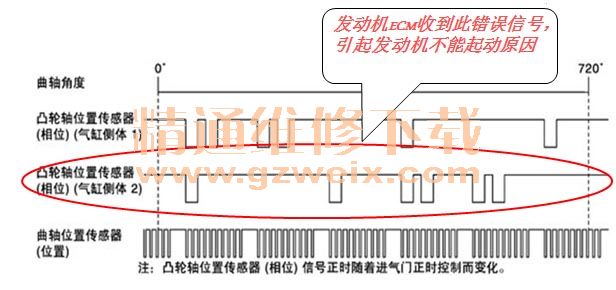 我们最终得出发动机不能起动原因是由于曲轴与凸轮轴位置相对错开了(点火正时不对),凸轮轴位置传感器 (相位) 感应凸轮轴 (进气) 的位置,以此识别特定的气缸,当曲轴位置传感器 (位置) 系统失效时,造成发动机不能起动的直接原因,如图所示: