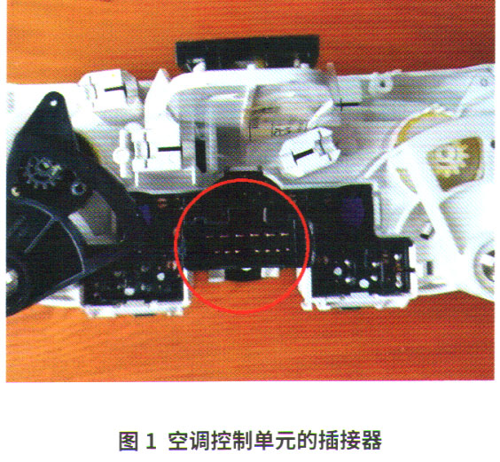 拆下集成A/C开关的空调控制单元,拔下14端子的插接器(图1)。根据电路图的指引,14端子插接器对应的1号与8号端子属A/C开关占用。用万用表导通挡测量1号与8号端子,无论开关处于开启还是关闭位置,万用表显示的数据均不导通,确认A/C开关存在故障。