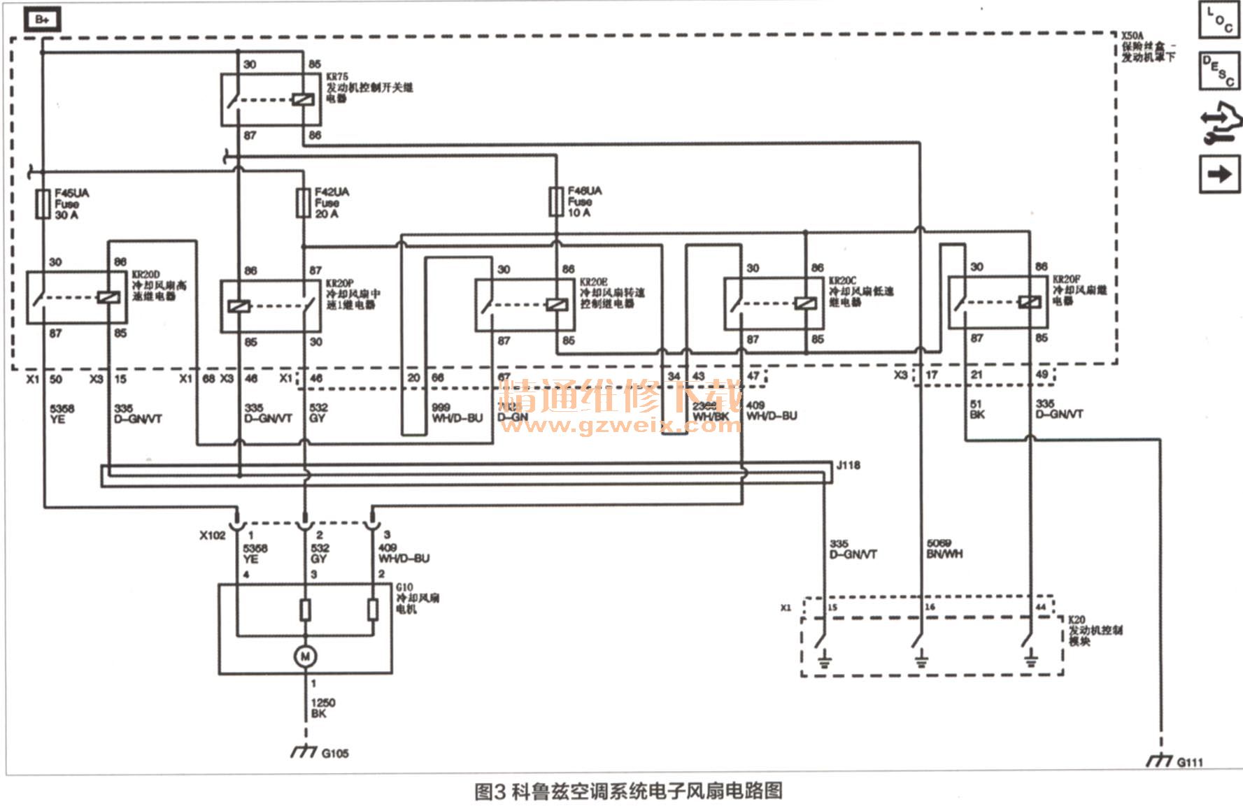 故障诊断:空调压缩机正常运行,而电子风扇未工作,空调系统散热不良会导致高压管路压力迅速增高,但上述情况的空调管路压力未增高,有两种可能:一是压缩机电磁离合器自动打滑,二是空调管路内制冷剂不足。经仔细观察,压缩机一直在工作,电磁离合器也未脱开,于是基本可以判断是空调系统管路制冷剂不足。通过罗宾奈尔AC350C加注机,给空调系统重新回收、加注了R134a,再启动空调,高压管路的压力迅速增至2000kPa,电子风扇高速运转后,压力回落至1100kPa,手握低压管路,感觉很凉,驾驶舱出风口也有强冷风吹出。加注制冷剂后,空调制冷效果已经显现,但高压管路压力波动异常,电子风扇未经低速档,直接运行中、高速档。翻阅维修手册,找到科鲁兹空调系统的电子风扇电路图(图3)。风扇有高速、中速、低速三个档位,五个风扇继电器的相互关系如下:冷却风扇继电器KR20F控制着冷却风扇转速控制继电器KR20E的工作电路,KR20E控制着冷却风扇高速继电器KR20D的工作电路;冷却风扇中速继电器KR20P独立工作;KR20F控制着冷却风扇低速继电器KR20C的工作电路。保险丝盒内的继电器布置如图4,因盖背面与继电器的标注严重不符,需测量才能判定对应的继电器型号。检测过程如下:拔下冷却风扇低速继电器KR20C,测量X102-3号端口至KR20C继电器87端口的电阻小于0.5Ω,测量KR20C继电器30端口的电压接近,2V, 86端口的接近12V, 85端口的接近0V,说明继电器外部电路正常;用蓄电池电源正负极连接KR20C继电器的30和87针脚,能听见电磁线圈吸合声音,但用万用表电阻档测量86和85针脚的电阻,显示为无穷大,则可判定KR20C已损坏。更换KR20C后,经验证,空调制冷效果良好,高压管路压力缓慢升至1600kPa,电子风扇低速档开始工作,压力又回落至1200kPa,空调系统故障最终排除。