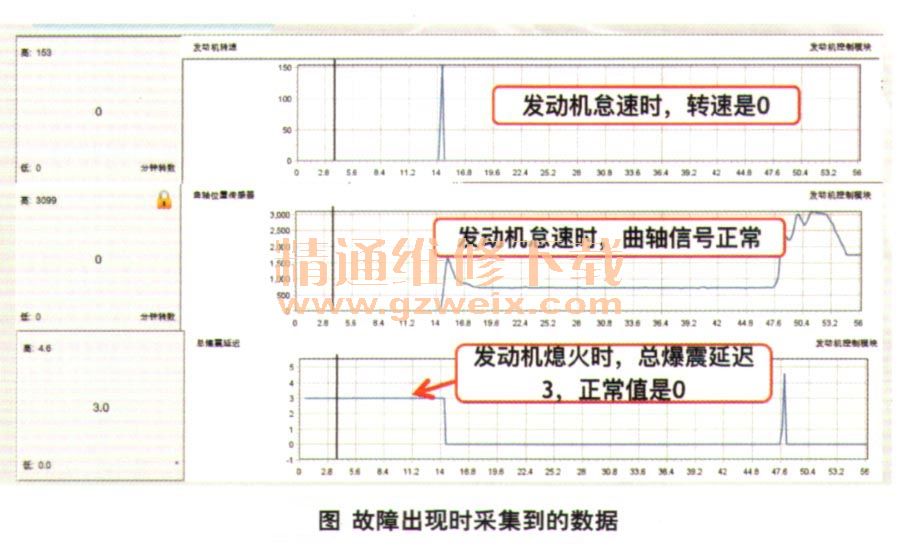 马上连接故障诊断仪,再次起动发动机,发现数据流有异常,其中发动机转速数据一直为0 r/min,而此时从曲轴位置传感器得到的转速数据却是正常的(图1)。另一个奇怪现象是,在发动机起动前,已经有了3°的爆震推迟。读取发动机故障码,发现有P0335故障码。