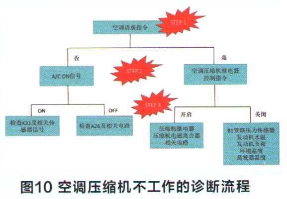 对于空调压缩机不工作的故障诊断流程可以按照图10所示的流程进行。该诊断流程适用于目前市面上大多数车型,不再一一赞述。