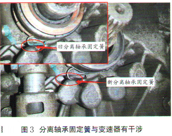 原本以为问题彻底解决了,又过了5天左右,该车再次进厂,驾驶员再次反映该车加速无力,尤其是在时速50km/h的时候。难道上次维修又没有成功?这次决定与司机一起试车,没想到挂1挡,放开离合后,踩下加速踏板,发动机转速上升到3500r/min,车辆竟然慢慢移动。明显的离合打滑的故障现象,于是决定更换离合三件套。没想到更换离合三件套后,车辆在踩下离合踏板的时候,竟然无法挂进挡,而在发动机停止的情况下,很容易挂进各个挡位。发动机运转情况下无法进挡,证实离合没有分离,经调整离合线到最短处,发现仍然无法正常工作。难道是离合片装反了?没有啊,装的时候,位置正确无疑,是分离轴承没有正确安装?安装分离轴承的时候,我就在旁边看着,装得应该没问题。到底是什么问题呢?怀疑是离合压盘问题,不管如何,先拆下变速器,拆下离合压盘与旧的对比,没有明显的区别,把新旧离合压盘分别放在压床上,用工具模拟分离轴承工作时,慢慢往下压,虽然新的压盘好像要用力度大些,但是它在千斤顶的液压下,每压一下,压板就会回缩一些。按理说,虽然这种情况会导致离合重,但是它仍然是会分离的。那么问题在哪里呢?对比离合片,无任何收获,当看到新的分离轴承安装位置的时候,一个细节引起了注意:新安装的分离轴承的固定卡簧与变速器某个部位有干涉,而旧的却没有干涉(如图3所示新旧分离轴承的固定卡簧的细节),对比新旧分离轴承安装的最低点,新的分离轴承安装后,拨叉与固定卡点的距离为17.6cm,旧的为18.5cm,差了0.9cm,如图4所示,而拨叉杠杆比为:5.8:13(5.8cm是变速器里与支点之间的距离,13cm是变速器面支点与拨叉拉线中点拨差可移动位置相差(长了)0.9cm,则里面分离轴承可移动距离会多移动5.8/13×0.9cm=0.4cm=4mm,分离轴承多4mm的分离距离,对于离合压板来说,可移动距离可能是1mm左右,而这1mm对于离合分离是至关重要的。