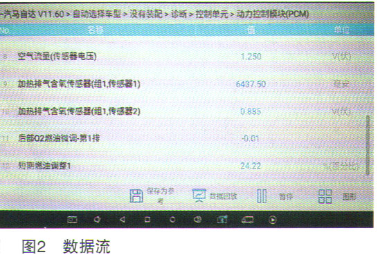 通过图1中数据,我们确认此混合气燃烧存在间题,因为HC即是未燃烧的汽油,该成分的增加必然会导致油耗升高,另外一个CO成分也明显偏高,说明该车混合气过浓,燃烧过程中因为缺氧形成大量的CO排出。