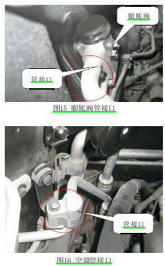 经常检查空调管接头和加氟口(如图15、16、17所示),及时发现管接头的油迹,并及时进行紧固、清理和维修,既能保证空调的正常运行,也能及时发现、维修氟利昂泄露故障,减少氟利昂对空气的污染。经常对冷却系水管(如18所示)、暖风水管接头进行检查(如图19所示),及时发现渗漏并进行维修,不仅能保证发动机的正常运行,也能保证空调的正常工作。