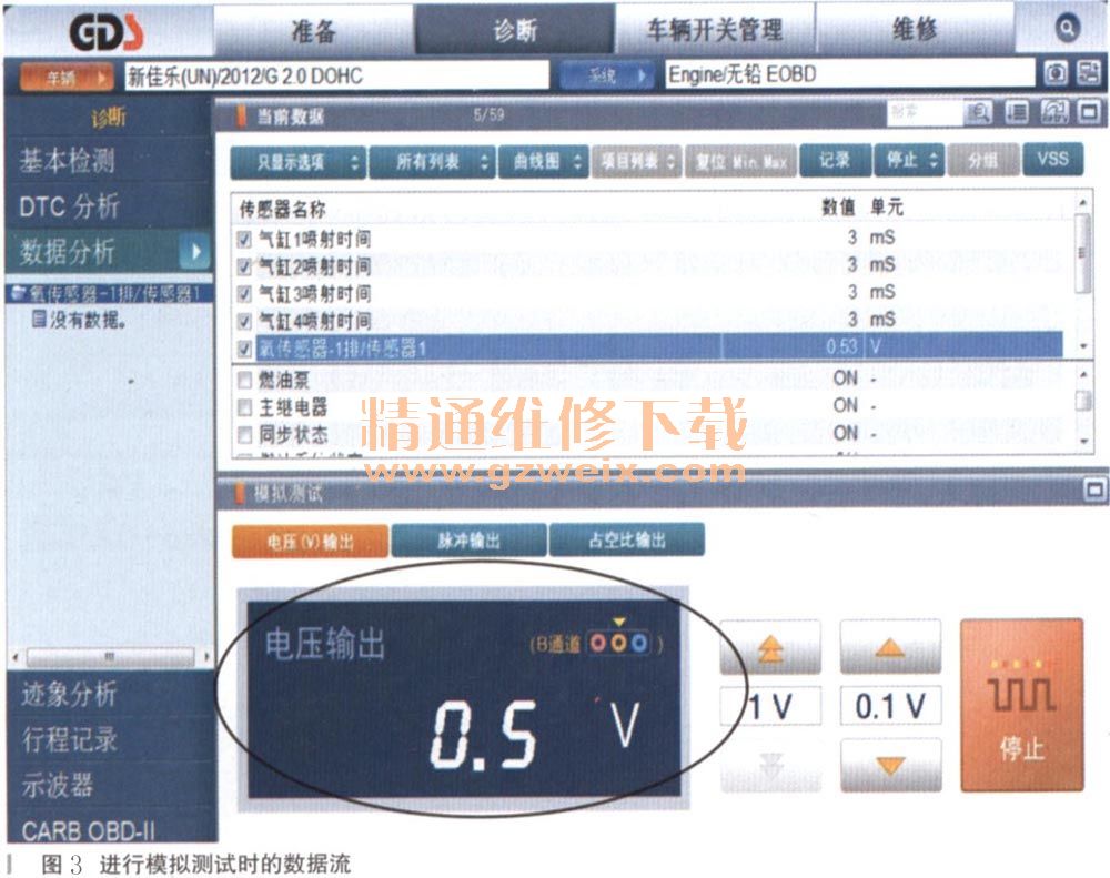 故障诊断:根据车辆当前的故障现象,我们首先可以确定的是该车发动机的混合气过浓。而一般导致混合气过浓的故障原因有进气系统堵塞,喷油器泄漏,空气流量传感器信号失真,氧传感器失效等。维修人员接车后首先对进气系统进行了简单的检查没有发现问题。使用起亚汽车专业诊断仪GDS对发动机系统进行自诊断,读取的故障码为:P2187,系统过稀;PU170,燃油修正异常。然后维修人员又读取了发动机在怠速工况时的相关数据流,其中喷油脉宽为7ms,空气流量传感器是13.7kg/h,前氧传感器的数据为0.13V:如图1所示。综合分析读取的数据流和故障码,我们可以发现,前氧传感器向发动机ECU提供的是一个混合气偏稀的信号,发动机ECU收到了这一信号后控制延长喷油器的脉宽,可是当发动机ECU持续延长喷油脉宽到极限值时,发动机ECU收到的前氧传感器信号依然是混合气过稀的信号,这时发动机ECU就会记录故障码P2187和P0170(如图2所示)。在我们读取的数据流当巾,空气流量传感器的数据比标准值要偏大一些,但是这个数值在实际的维修当中也是基本上可以接受的,并不会造成这样的故障现象,这就可以暂时排除空气流量传感器的问题。那么导致这种情况下混合气过稀的故障原因有:排气管泄漏,氧传感器故障,发动机ECU故障和相关的线束插接器接触不良。当前车辆的发动机ECU可以根据氧传感器的信号控制延长喷油脉宽从而进行燃油修正,而且在燃油修正达到极限值时又可以正确记录故障码,这一过程基本上可以证明发动机ECU是正常的。接下来维修人员又对整个排气管的密封状况进行了检查,也没有发现排气管有泄漏的情况。那么只剩下氧传感器和线束方面的问题,这时我们使用诊断仪的模拟测试功能,将测试用的探针连接到前氧传感器插接器的信号端子,然后操作诊断仪,人为的向发动机ECU输入一个0.5V的电压,这时在诊断仪上读取到的前氧传感器数据也变为了0.5V(如图3所示),而喷油脉宽也随着降到了3ms左右,通过这一测试可以证明从前氧传感器插接器到发动机ECU之间的线路是正常的,而且更可以进一步证明发动机ECU也是正常的,那么故障的原因就是前氧传感器本身,更换一个全新的前氧传感器后故障排除。
