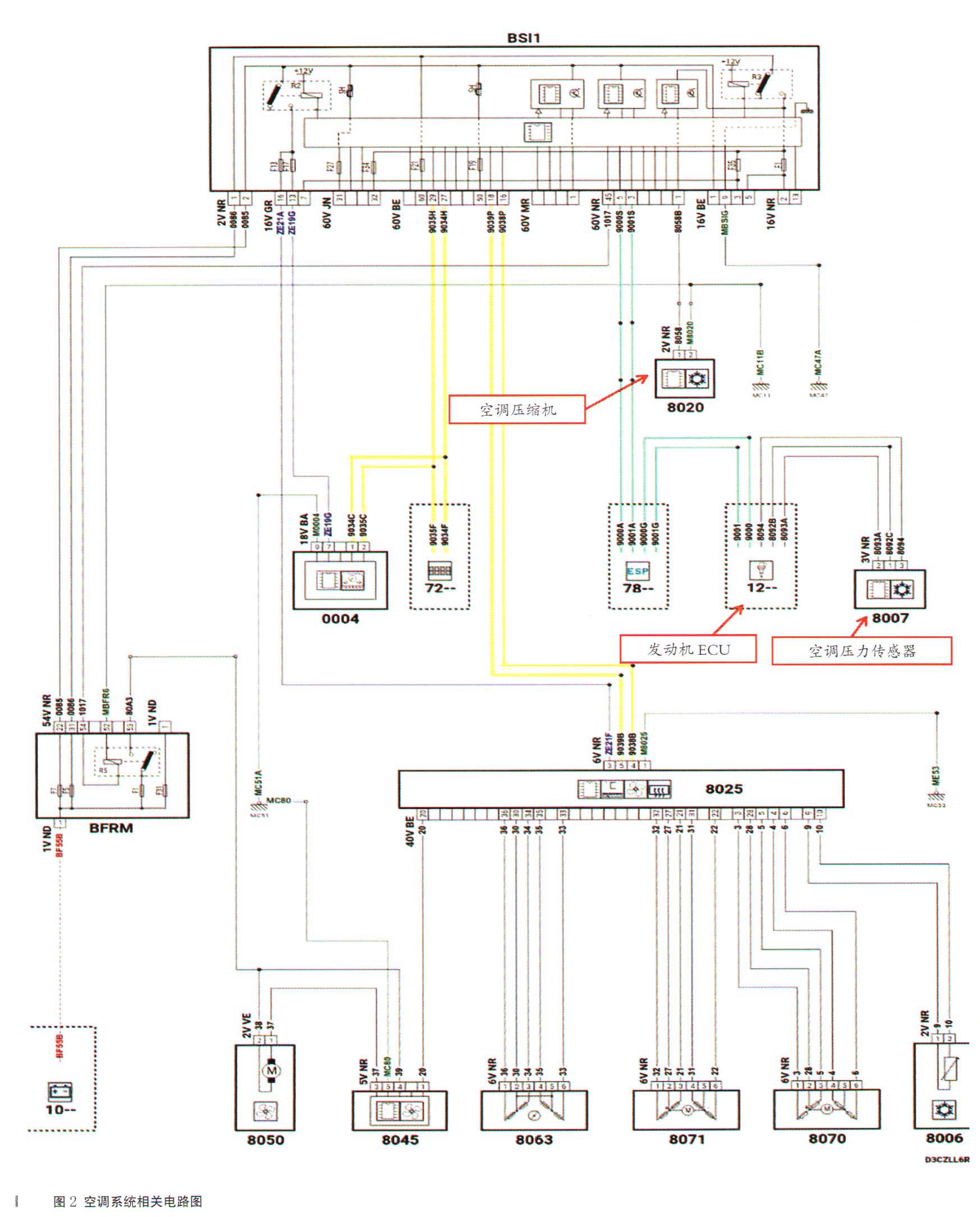 ECU,而压缩机功率输出占空比却是由BSI控制正电压输出,另外一条线直接搭铁(如图2所示,其中8007为空调压力传感器,8020为压缩机)。而前期检测很明显,现在剩余可能原因只有两个:①压缩机电磁阀阻值不对导致BSI输出不正常;② BSI功能故障或者BSI输出线路故障。叫大量取了BSI空调输出到变排阀之间线路,结果单线为1. 5Ω,正常啊,难道是BSI故障或者真的是压缩机变排阀问题一一特别留意了原车的压缩机与新来的压缩机的变排阀阻值,均为11.2Ω。之前曾经想利用12V继电器更换原车的空调控制线路(变排改定排),把变排几阀两条线分别搭在12V继电器的85/86脚,发现可以驱动吸合,但当再次检测变排阀的电压时,竟然发现空载的时候有约13.5V系统电压,而接上5W试灯后,却无法驱动试灯,难道真的是BSI故障?BSI保护了?再次检测X431 PAD III全部系统,除仪表有一个B1003故障外,均无故障。而B1003,经与4S店同行咨询,说并不知道是否会影响空调工作,但是在网络查询后,显示其实为倒车雷达方面故障,并不影响空调系统。为了使BSI复位,断开