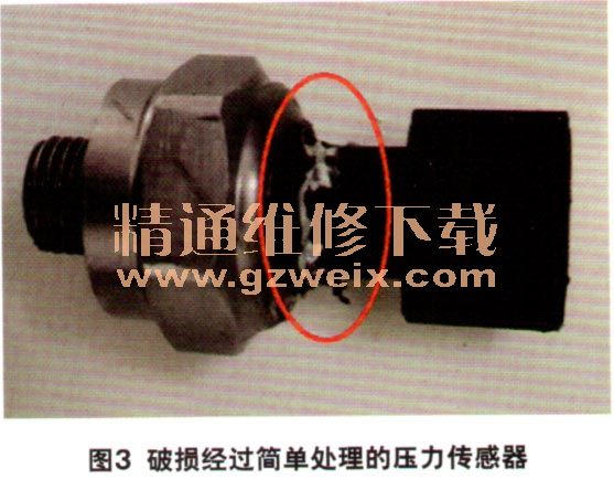 该车变速器的2个压力传感器(图2),下边那个在事故中已经受损,而另一个也在从车上拆装变速器总成时不小心有了磕碰。损坏部件需要给保险公司拍照,因此我厂维修人员接修变速器后,只是更换了一个全新的压力传感器,而另外一个则是通过简单处理后继续使用(图3)。难道是那个有损伤修复使用的压力传感器有问题?判断压力传感器是否存在故障很简单,就是把2个压力传感器进行对换试验