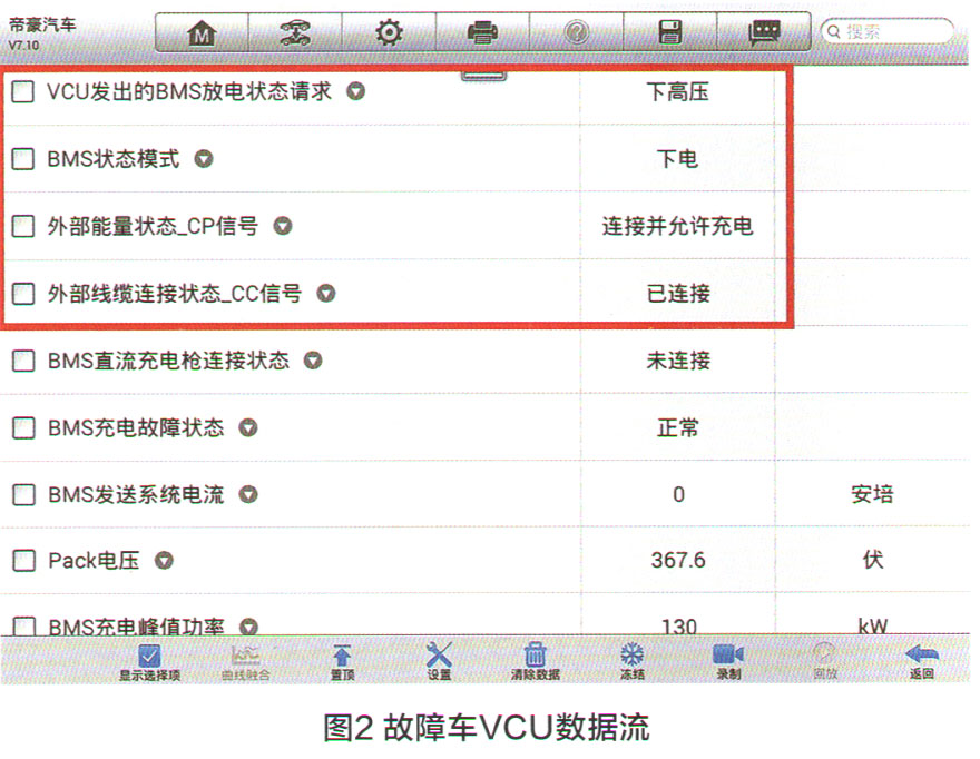 数据流发现, VCu数据流中已检测到交流枪信号(图2),但VCu控制BMS下高压,无法给动力电池进行充电。