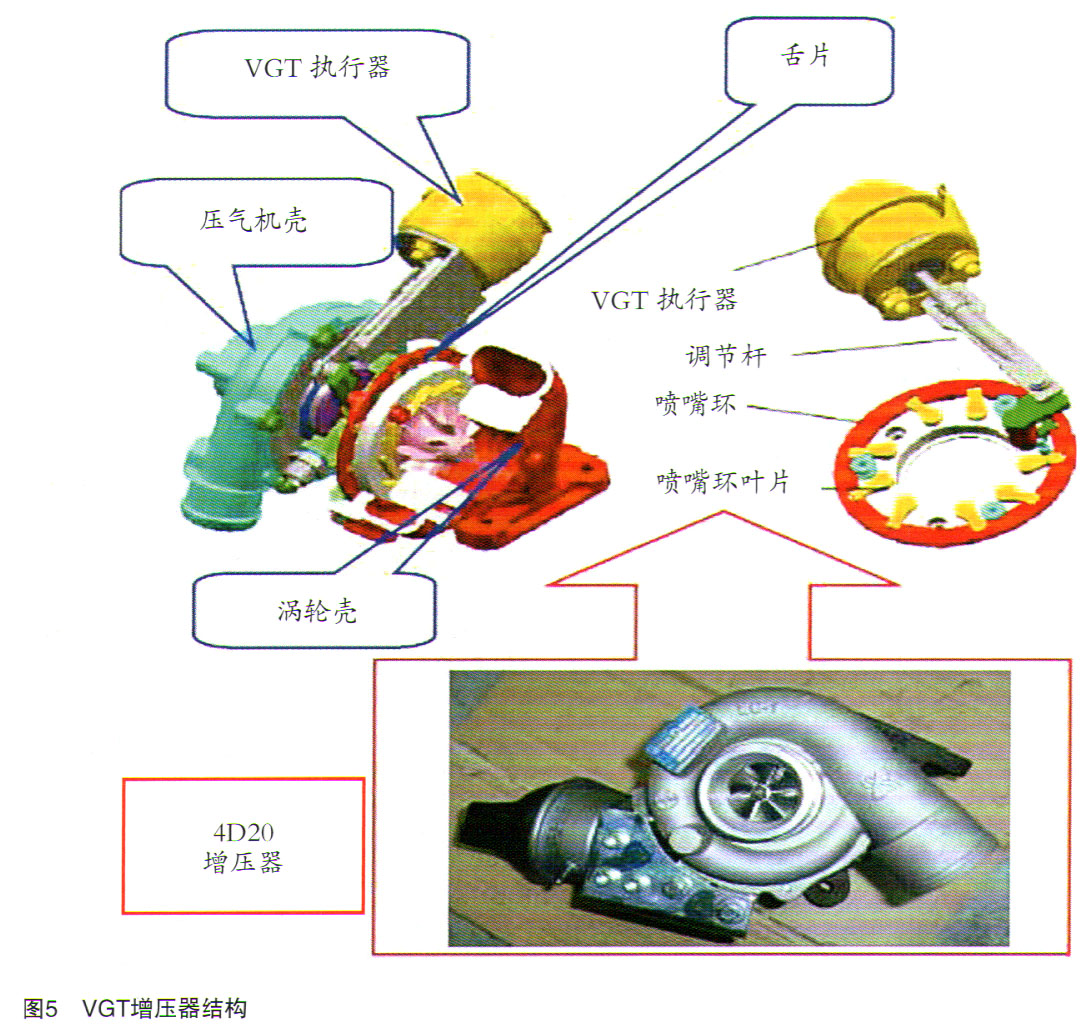 该车德尔福4D20发动机匹配的是可变截面VGT增压器(如图5所示),通过增压器上的VGT执行器来调节喷嘴环的开度,从而控制增压器的涡轮转速和增压压力,而VGT执行器是一个真空控制的膜盒,发动机