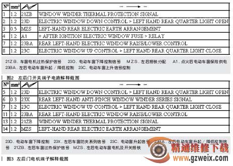在该线路中,从 645 车身控制单元中有两根连线通过两个节点分别通向 4 个门窗控制开关和门窗电机,图中左前门窗控制线路和其他 3 个门控制线路的不同点是:车身控制单元的黄色线除了到 132(左前门窗电机控制开关)和 203(左前门窗电机),其余则是仅仅到各车窗控制开关,没有到各个电机。从车身控制单元 645 中引出的蓝色线除了到 4 个车窗控制门窗电机外,还通向 132(左前门窗控制开关),而其余控制开关则不连接此线。而上述故障特点是,除了左前门窗可以正常工作外,其余的则只能降不能升。从故障现象分析,只要排除了左后门车窗的故障,那么就可以排除其他故障。如果从电路中分析出在什么情况下才有可能引起故障发生,那么问题就会迎刃而解。图 2 和图 3分别为左后门开关端子电路和左后门电机端子解释图。