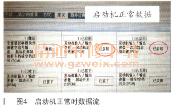 维修此故障首先了解启动机的工作原理,按下发动机停止/启动开关时,车辆模块收到开关信号,检测到车辆存在有效的智能钥匙,则CJB(中央接线盒)会通过硬线向ECM(发动机控制模块)发送启动请求。当ECM接收到P挡或N挡信号且制动踏板已踩下,它会给启动机继电器线圈提供电源和搭铁,启动机工作。根据启动机的工作原理,读取与启动机有关的数据流,如图3所示。变速器处于P挡,制动开关1和制动开关2显示“已按下”,表明制动踏板已踩下,发动机控制模块禁止启动机工作。按下停止/启动开关,仪表报警灯在打开和关闭循环,说明停止/启动开关没有问题。正常的数据流如图4所示,启动机应是“已启用”状态,而不是“已禁用”。问题出在哪里?条件都满足为什么启动机不工作呢?