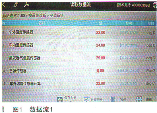 此车装用的是自动空调,用朗仁H6 Pro解码器进人自动空调控制单元,读取故障码,显示系统正常。查看