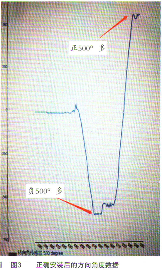 故障解决:把方向角度传感器顺时针转720°后,接上插头,左右都可以转到550°多,仪表故障灯不点亮,试车,一切正常,如图3所示。