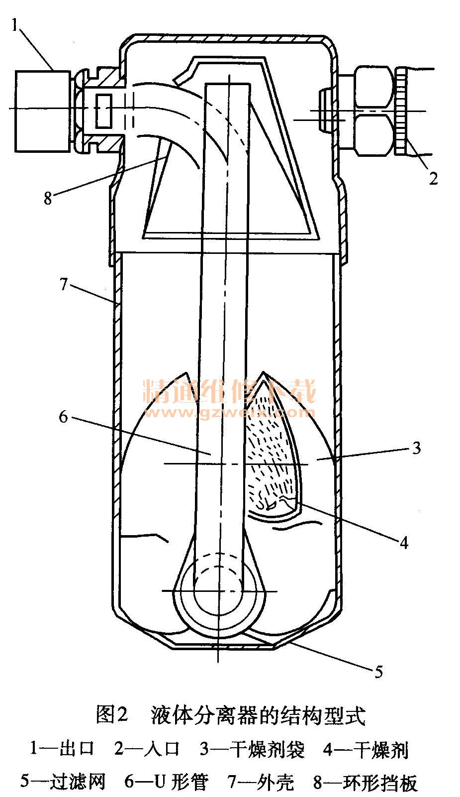 在拆检空调系统部件时,空气及水分会进入空调管路中,如果抽真空不彻底,那么空气及水分会存留在空调管路中。这不仅会降低制冷效率,而且水在制冷剂循环过程中会结成冰块,造成管路堵塞,直接影响制冷剂在管路中的正常循环,导致制冷效果变差甚至不制冷。当冰块熔化后,制冷剂恢复循环,制冷效果又会正常,因此故障呈间歇性出现。冰堵多发生在通道截面较小之处,如液体分离器、节流管、滤网等部件。红旗轿车使用节流装置代替热力膨胀阀,因此在蒸发器中不可避免地会有制冷剂液体存在。为了防止制冷剂液体流入压缩机,在蒸发器出口处设置了液体分离器,分离从蒸发器流入压缩机的制冷剂液体。液体分离器不可维修(图2),若制冷系统发生堵塞或结冰现象,应更换液体分离器。