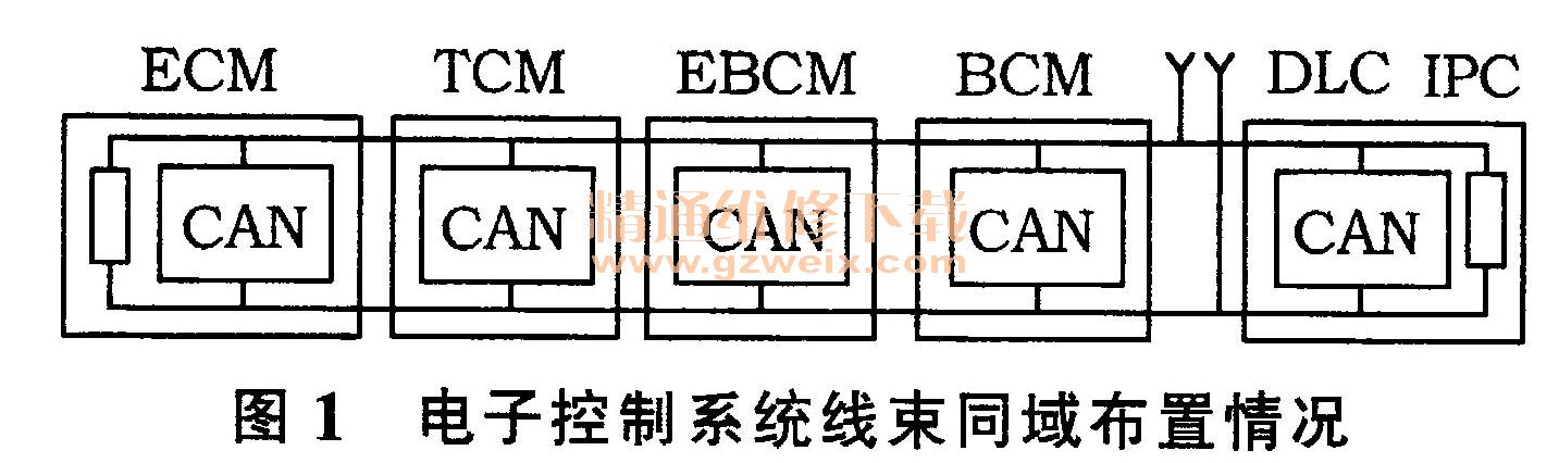 对比手动档MT车辆无此类故障,且AT车型该故障呈间歇性表现,自动变速器电子控制系统TCM受电磁信号干扰,车辆进入限制模式。现代汽车的电子控制系统配置日益增多,且功能呈集成化发展,其信号接收和指令传递往往通过CAN线,不同功能元件收取不同频率的电磁波,这就是现代汽车线束同域布置特点。图1为该车型包括TCM在内的电子控制系统线束同域布置情况。