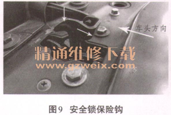 调整发动机舱盖和周边部件的间隙,需要频繁调整位置,很多时候需要盖上发动机舱盖来验证调整效果,锁头和锁鼻位置也跟随改变,如果误盖上发动机舱盖,再继续就非常困难了,所以维修第一步要拆下主锁锁头。主锁和安全锁是不一样的,锁鼻是固定在发动机舱盖上的,无法拆卸,锁头是通过螺钉固定在发动机舱盖上的,使用扳手即可完成拆卸,如图10所示。锁鼻无法拆解,但是通过图9可以发现和锁鼻配合的保险钩位置,通过拧松保险钩左右各一颗六角螺钉即可调整安全锁钩的位置,实现与锁鼻的良好配合。这里不需要拆卸保险钩,只需要将保险钩用细铁丝捆扎到后面部件上,使其处于开锁状态,不让其回弹锁住锁鼻即可顺利进行维修。