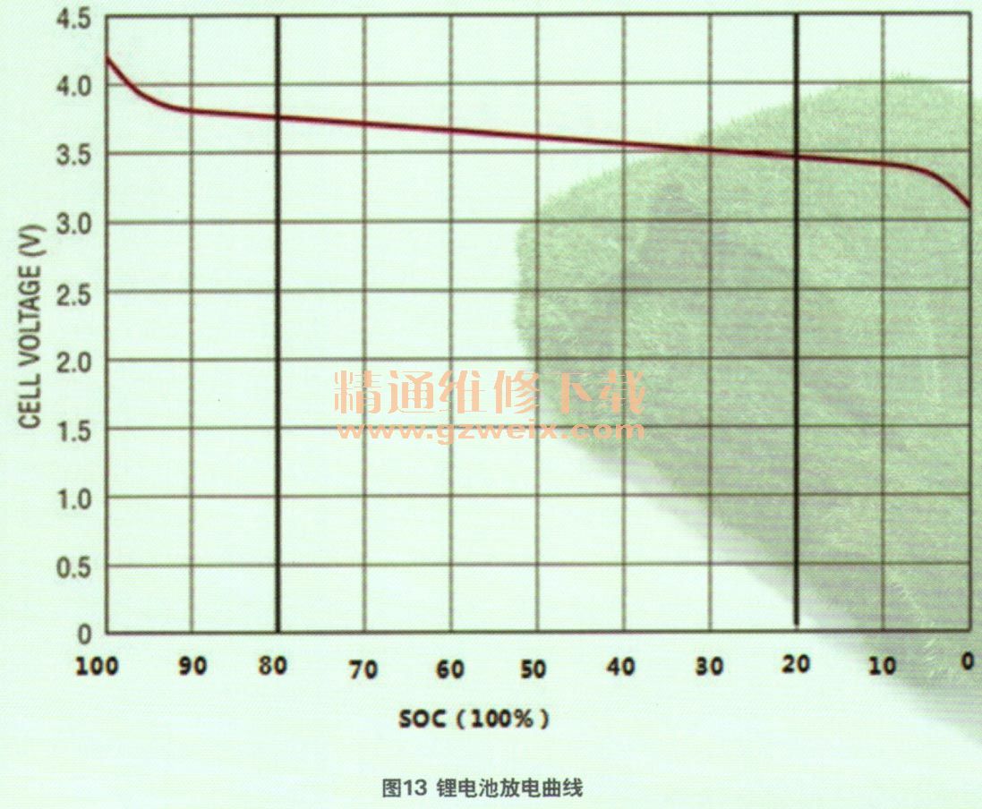 图13是锂电池的放电曲线,曲线在整个工作区间有一个恒定的5mV/%(soc)的斜率。充电时也有类似的曲线,但是曲线是上升变化的。简单的充放电控制电路就是根据电压的变化值,判断电池的荷电状态是快充满了或是快放光了,进而控制电池充、放电是否停止。我们可以通过测量电压判断电池的荷电状态SOC。