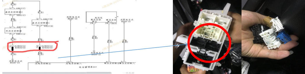 4.对高压互锁2线路和各接插图件进行排查,发现在A柱下方的接插件出现了腐蚀现象,分枂车辆贴膜导致插头进水,对各接插件进行处理后试车故障排除。
