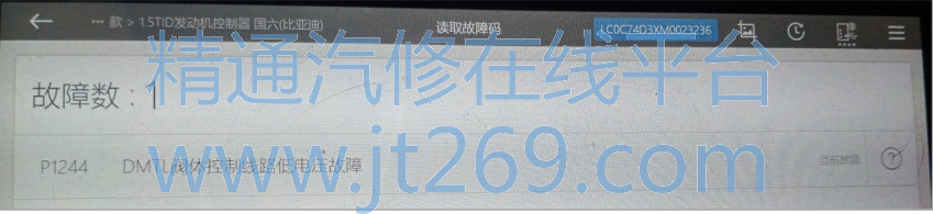 故障描述:一辆宋 MAX DM 车型, 在做出库 PDI 时发现仪表亮发动机故障灯, 用 VDS 扫描系统无升级,读取发动机 ECU 故障码为“P1244 DMTL 阀体控制线路低电压故障” , 故障码无法清除。