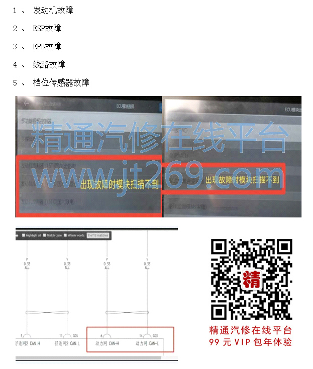 故障现象:车辆停下时或者等红绿灯时。 仪表会出现“请检查发动机系统,电子驻车系统, ESP系统。”档位无法切换,车辆无法行驶。