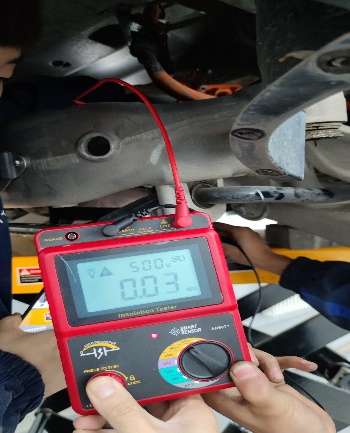 1.经过后台数据读取,确认低压正常,并非车辆亏电,且通过后台数据观测车辆出现绝缘异常,经过测量绝缘初步判断绝缘点为后电机及其高压线束存在异常。