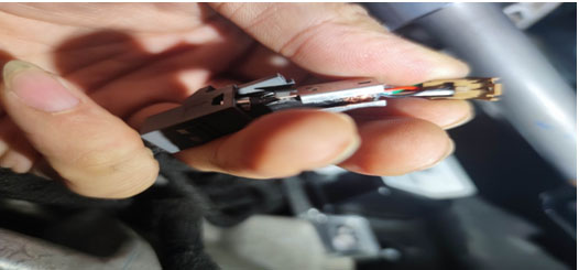 5.怀疑该插接器接触不良,因其内部端子非常细小,分解该插接器,将其端子逐一取出再次检查未见“扩孔”迹象,且使用大头针逐一插入时的“阻尼手感”一致