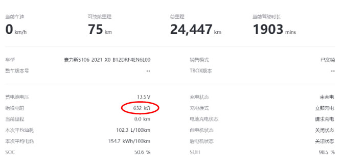 2、根据BMS和VCU的故障代码判断为高压线路或部件存在绝缘故障,通过VHR查询车辆绝缘电阻只有632KΩ,也印证了上述判断,正常SF5该值为1500KΩ左右;