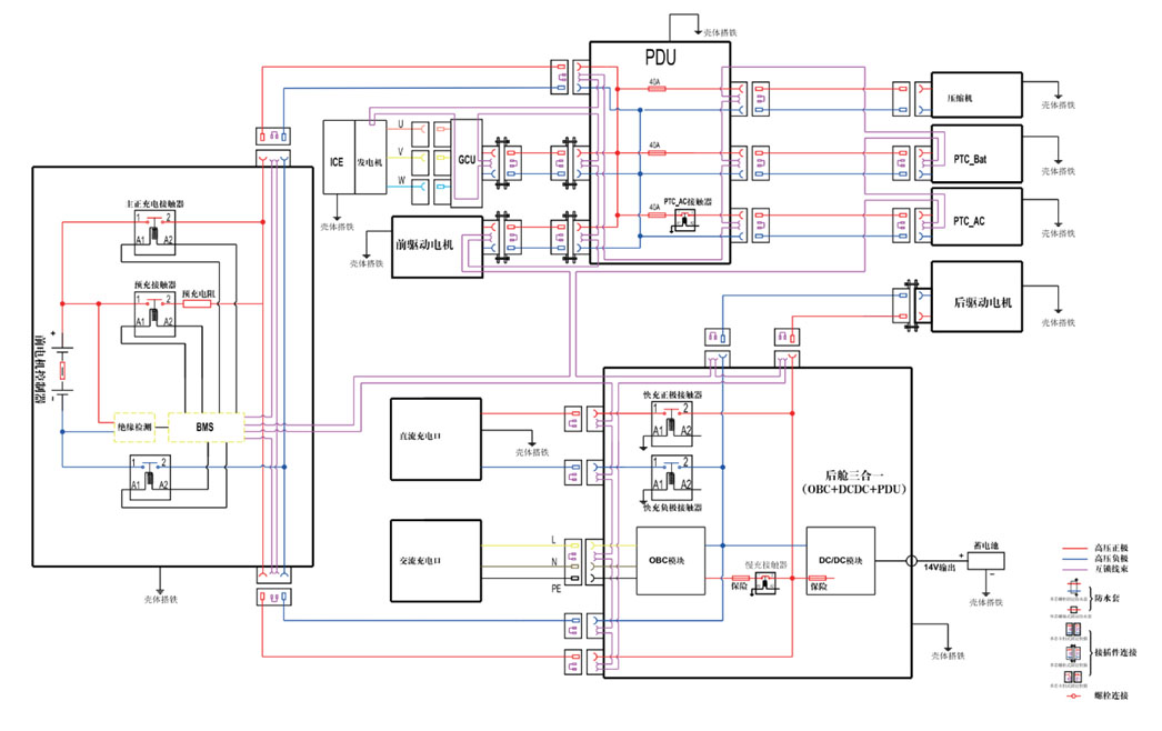 4、根据SF5高压系统连接图示,可以将整个高压系统分为三个部分进行排查: