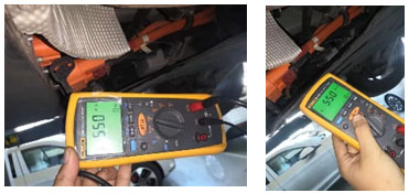 7、断开电池后部高压线束插头,测量前部线束插头正极和负极对车身的绝缘电阻,结果如下: