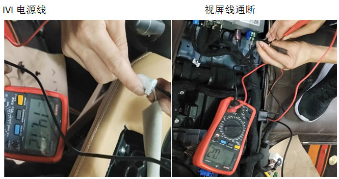 4.与客户沟通同意拆卸检查后,检查保险片未有烧断和接触不良情况,拆卸IVI显示器ABA对换验证,故障A车对换B车能正常点亮证实显示器正常,测量显示器电源主正主负12VZ正常,显示器唤醒线12V正常,测量显示器到IVI主机视频线通断四跟导通,证明IVI主机插端到显示器正常