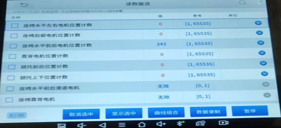 数据流信息发现座椅上下前后电机位置信息值为无效值,除水平前后位置电机外其他电机位置计数信息为零,手动调节座椅计数信息依旧为零;重新复位座椅后电机位置计数均为零,对座椅进行学习后,仅水平前后位置电机计数为343,且前后调节时值随之改变,但其余位置电机计数信息依然为零。