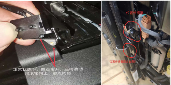 3.由此初步怀疑为位置学习时座椅未进行水平左右和其余位置学习因此计数值为零;通过查询相关资料,位置传感器正常状态下,触电常开,座椅滑动时滚轮向上,接触后触点闭合,初步怀疑位置传感器与配合金属片接触不良导致位置信息丢失,座椅未进行水平左右位置学习。