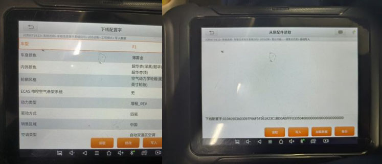 3、读取一辆车配置字写入,进入车辆工程模式后发现可以选择配置和功能,修改完成后配置字恢复,更新ivi模块为最新,功能恢复正常。
