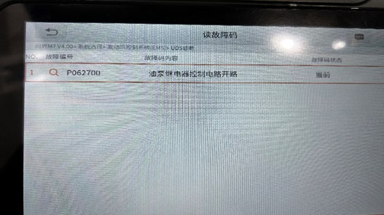 OBD故障灯。用诊断仪读取EMS模块故障码为:P062700 油泵继电器控制电路开路。通过故障现象和故障码能大概判断为燃油泵不供油导致。