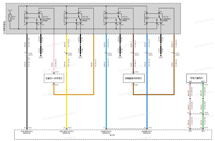BCM控制继电器工作来实现电机解闭锁,我们习惯看供电,但也要看搭铁情况,要保证电路一整套回路。另外我们点大屏加油口按键,IVI会通过网络传给