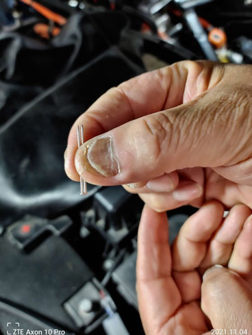 2.断开小电瓶的负极,拆下前舱高压盒上连接仪表台内PTC的高压线束插头,然后准备两根长度一致的大头针(如下图);