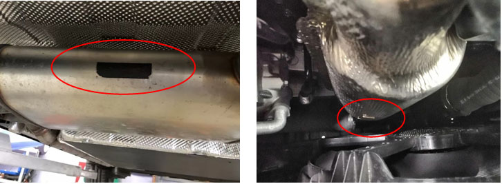 6.检查发现三元催化上的胶纸已经变黄,再次检查消音器上面的胶纸已经发黑