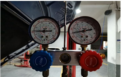 3.连接压力表,高压显示1.1MPa,低压0.7 MPa。低压高于正常0.15-0.3 MPa范围,高压低于正常1.5-2.0 MPa;下图1