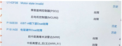 从诊断仪中我们发现后电机控制器报有 P160E00“IGBT”-A相下部Dsat故障,P161A00电驱驱动Dsat故障,当发现后电机报这两个故障时,可判定为电机故障。