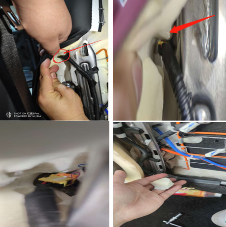 3.初步确认主驾驶座椅内部安全气囊线束走向问题,重新固定线束后故障消失,用户第二天反馈安全气囊灯再次亮起,经过和场内市场质量部技术团队远程沟通确定技术方案:将图片中凸起的海绵扣掉即可解决安全气囊因线束接触不良造成的仪表亮故障灯;