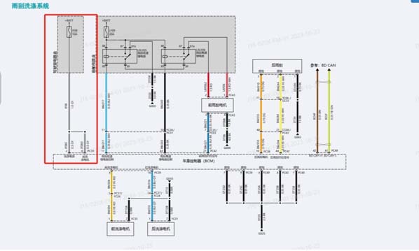 BCM里面控制功能打开前雨刮喷水,有电压输出,且会喷水。说明