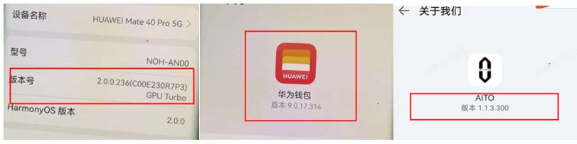 通过查看华为钱包、AITO版本分别为9.017.314和1.1.3.300均为最新