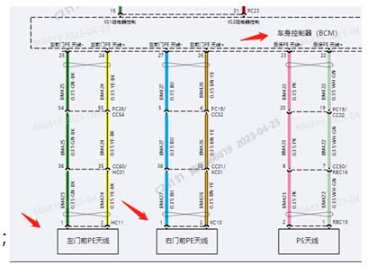 1.诊断有左前门和右前门PE天线故障码;首先怀疑PE天线故障,更换全新PE天线后故障依旧;