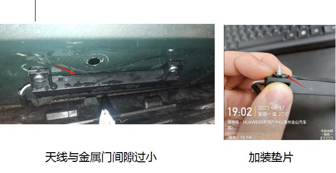 维修方案:两前门PE天线螺丝固定位置加装垫片,隔开PE天线与车门板接触。